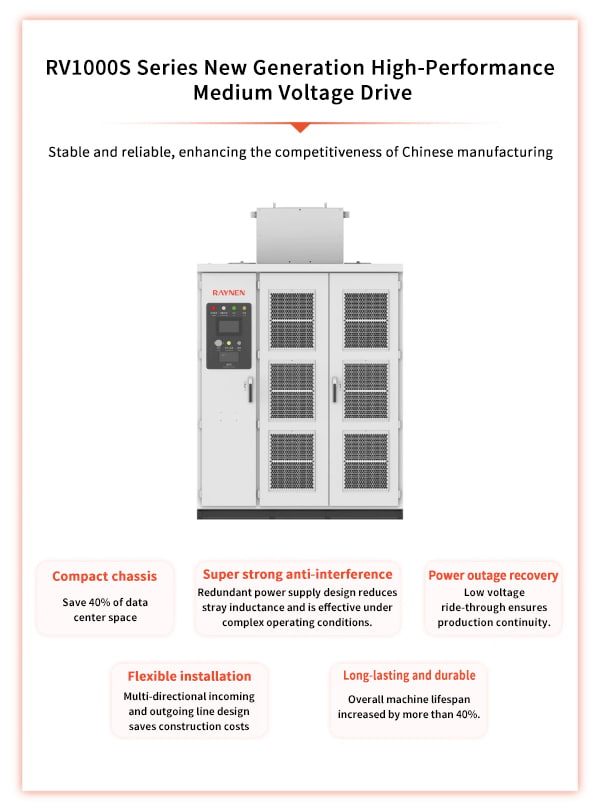 Low-voltage general-purpose/engineering models + Medium Voltage Drive full coverage. The new generation RV1000S Medium Voltage Drive is based on "book-shaped unit + integrated bus", with high power density, flexible networking, and compact size design, saving 40% of data center space.