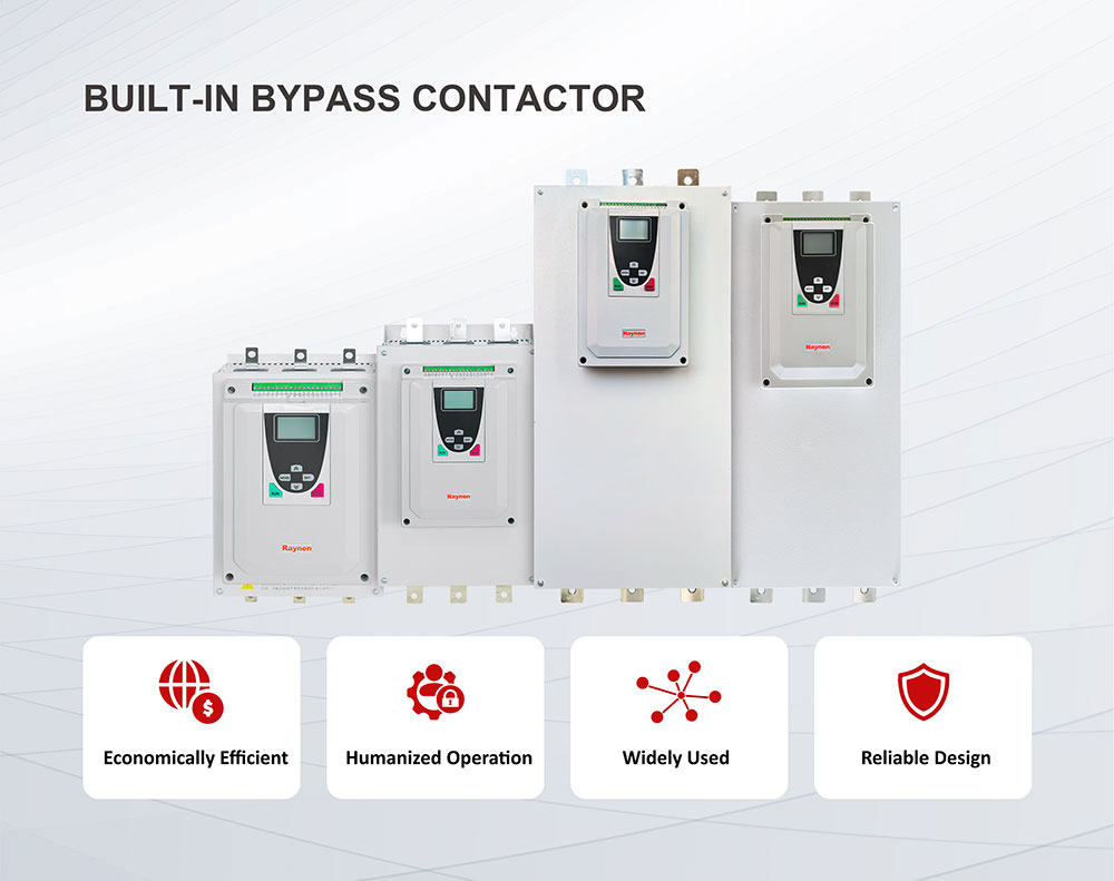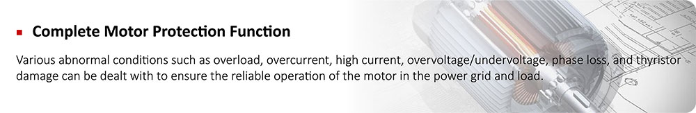Phase loss protection, overcurrent protection, overload protection, current imbalance protection, overheating protection, start timeout protection, undervoltage/overvoltage protection, start over frequency protection, high current protection, thyristor breakdown protection, power reverse sequence protection, wiring error protection, etc. |