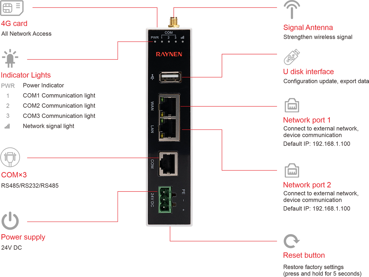 At the industrial equipment site, UBox can connect to Ruineng HMI, PLC, inverter and some instrument equipment, collect relevant equipment data, connect to the Internet through wired broadband, wifi, and 4G, and transmit the equipment data to the Ruineng cloud platform.