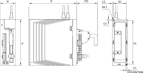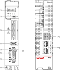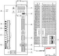 Description: ① Digital tube display: 5-digit 8-segment LED digital tube ②USB: USB Type-C interface, connected to PC ③CN1 (interface connector): output/input signal connection port, connected to programmable controller (PLC) or control I/O ④Fully closed-loop encoder connector: fully closed-loop interface, connected to external second encoder, '-FS' model supports this function ⑤CN2 (encoder connector): encoder interface, connected to the encoder on the servo motor ⑥L1, L2, L3 (main power input terminals): main circuit power supply, single-phase power supply is connected between L1 and L2 (200~240VAC, 50/60Hz power supply) ⑦L1C, L2C (control power input electronics): control circuit power supply, connected to single-phase power supply (200~240VAC or 380~440VAC, 50/60Hz power supply according to the model) ⑧R, S, T (main power input terminals ): Main circuit power supply, connect to three-phase power supply (200~240VAC or 380~440VAC, 50/60Hz power supply according to the model) ⑨P, B (external braking resistor connection terminal): use external braking resistor ⑩P, B1, B2 (external braking resistor connection terminal): use external braking resistor (remove the shorting piece between P and B1, connect to both ends of P and B2) ⑪P, N (N1, N2) (servo bus terminal): do not remove the shorting piece between N1 and N2, connect between P and N (N1) for multiple servos to share the DC bus ⑫N1, N2: connect external DC reactor (remove the shorting piece), short-circuit when not in use ⑬U, V, W, PE (servo motor connection terminal): servo drive output, connected to the motor power connector (U, V, W, PE) ⑭ Grounding screw: Connect to the power ground and motor ground ⑮CHARGE (bus voltage indicator): power indicator ⑰CN3 (connector for safety function): STO interface, only '-S/FS' models support this function ⑱CN4/CN5 (communication terminal): 485 communication port, EtherCAT high-speed communication port, CAN communication port |