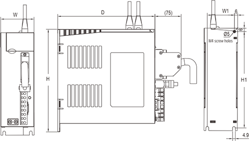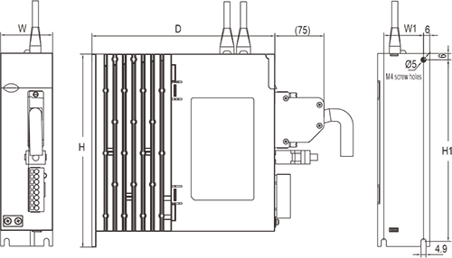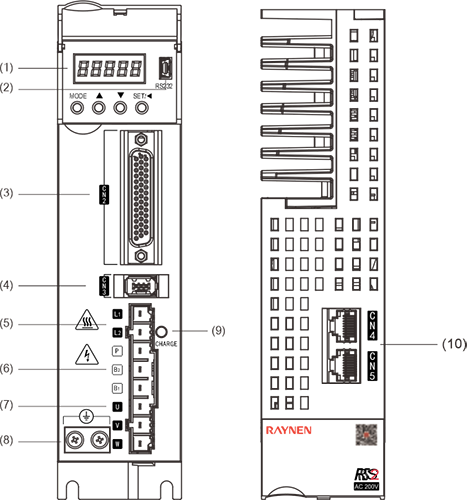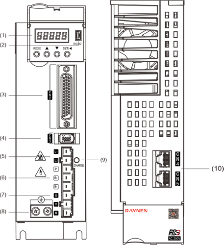 Description: ① -: Seven-segment digital display ②mini USB: RS232 interface, connected to PC ③CN2: Output/input signal connector, connected to programmable controller (PLC) or control I/O ④CN3: Encoder interface, connected to the encoder on the servo motor ⑤L1, L2: Main circuit power supply, connected to single-phase power supply (200~240VAC, 50/60Hz power supply) ⑥Brake: Use external brake resistor ⑦U, V, W: Servo drive output, connected to motor power connector (U, V, W) ⑧Ground screw: Connect to power ground and motor ground ⑨CHARGE: Power indicator light ⑩CN4/CN5: 485 communication port |